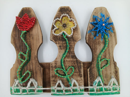 12" x 10" String Art Vintage Fence Post Red White Blue Yellow Flowers White Fence Nails String Gardening Vintage Garden Collection Hand Made Gifts Mothers Grandmothers Aunts Sisters