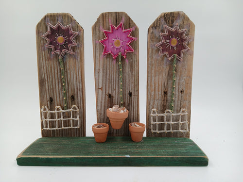 12" x 10" String Art Vintage Fence Post Pink Purple Flowers Small Pots Rocks Nails String Gardening Vintage Garden Collection Hand Made Gifts Mothers Grandmothers Aunts Sisters